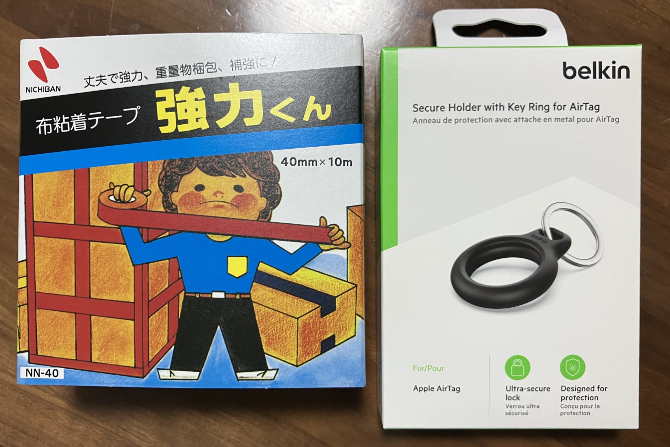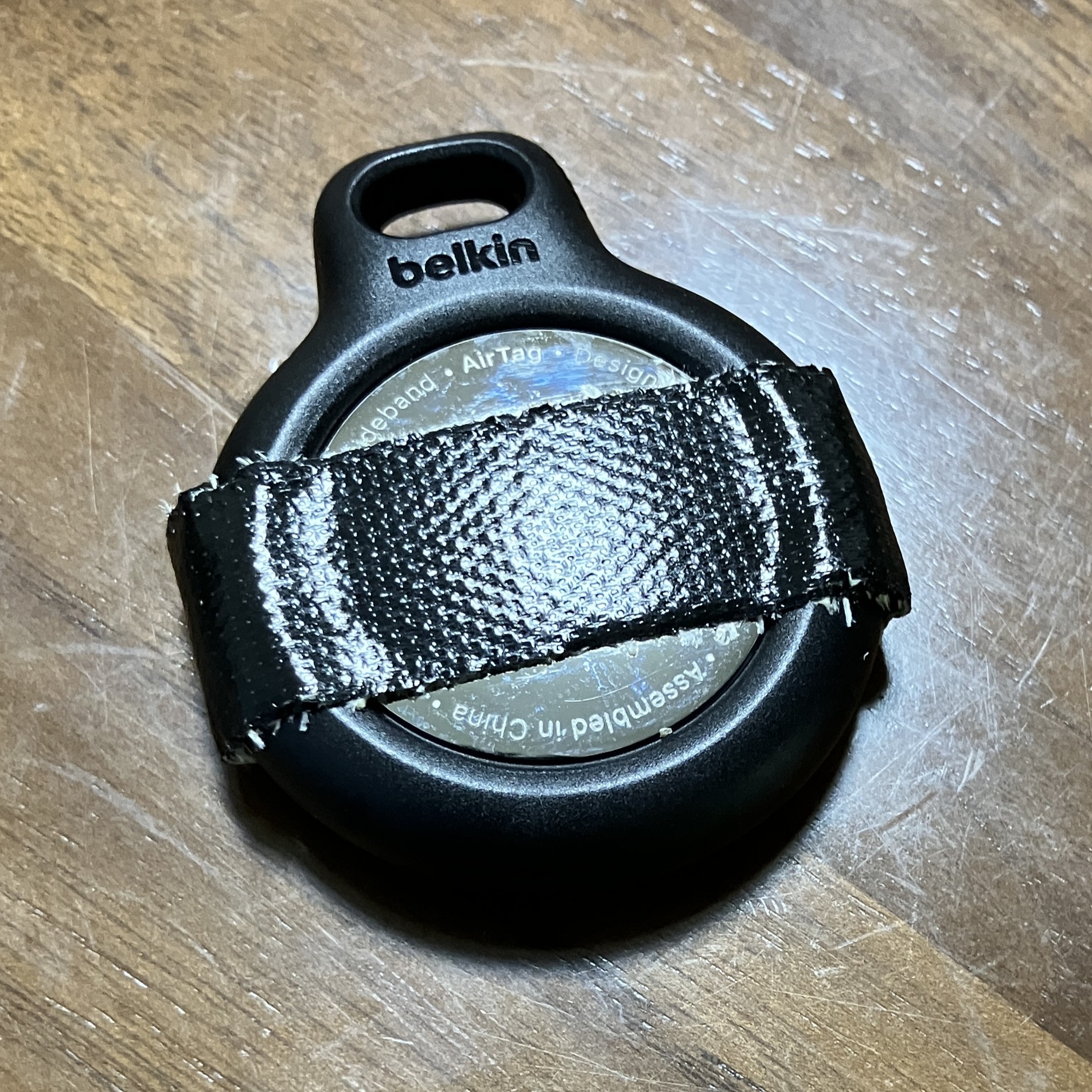自分の場合は、Belkinのキーホルダー型ケース と 目立たない布テープ を活用し、鍵に取り付けました。