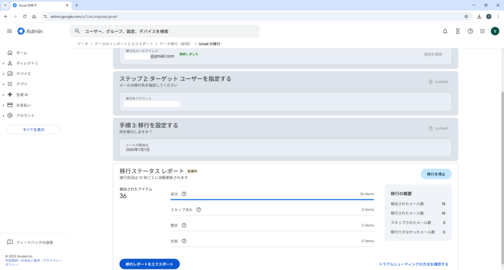 個人Gmailから、ターゲットにするGWSアカウントを指定して移行するだけ。